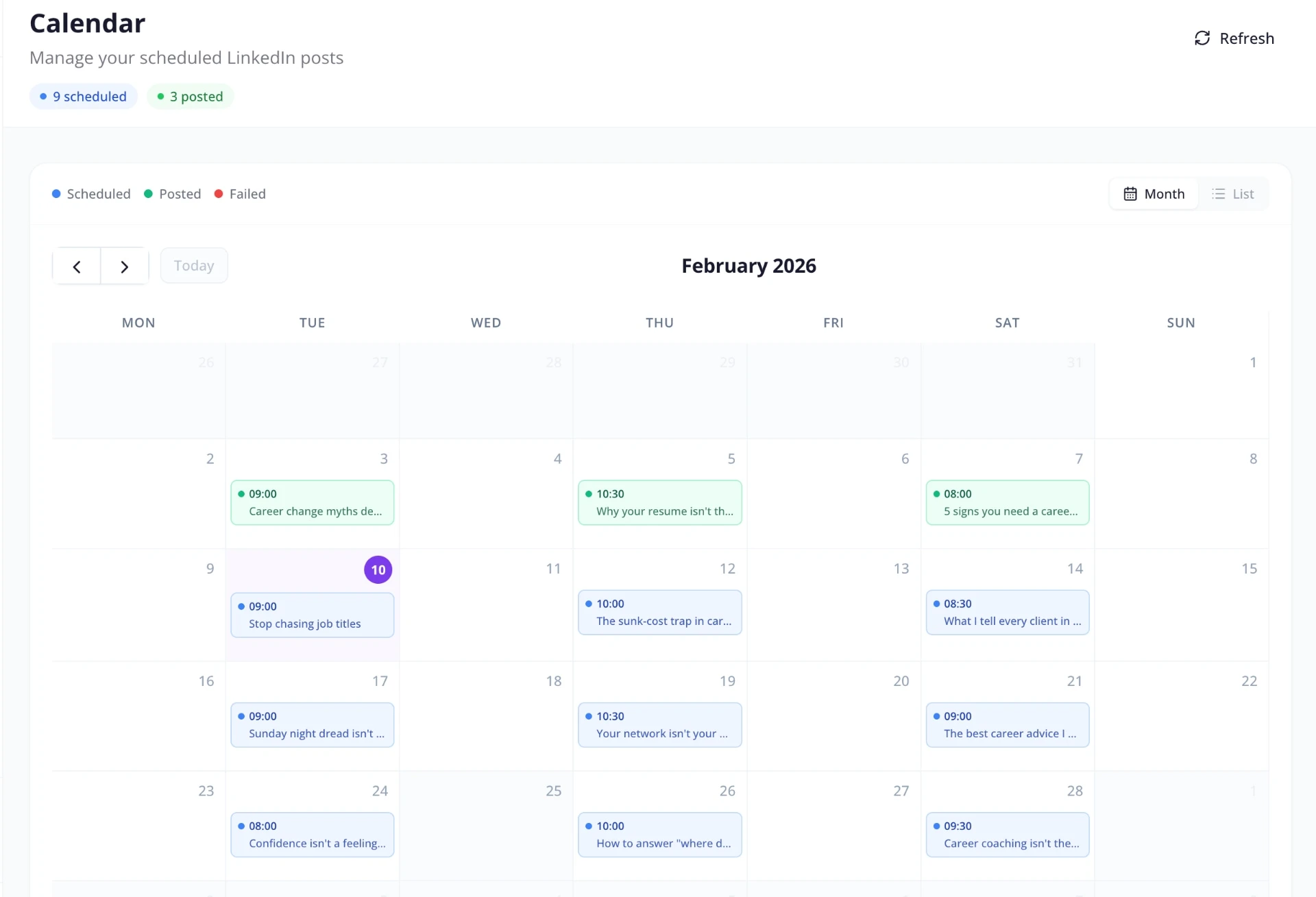 Use LinkedIn's native scheduler to queue posts in advance. Posting at consistent times, many coaches find Tuesday and Thursday mornings work well, helps the algorithm learn your rhythm. After each post goes live, spend 15-20 minutes actively responding to comments. The first hour matters most for reach.